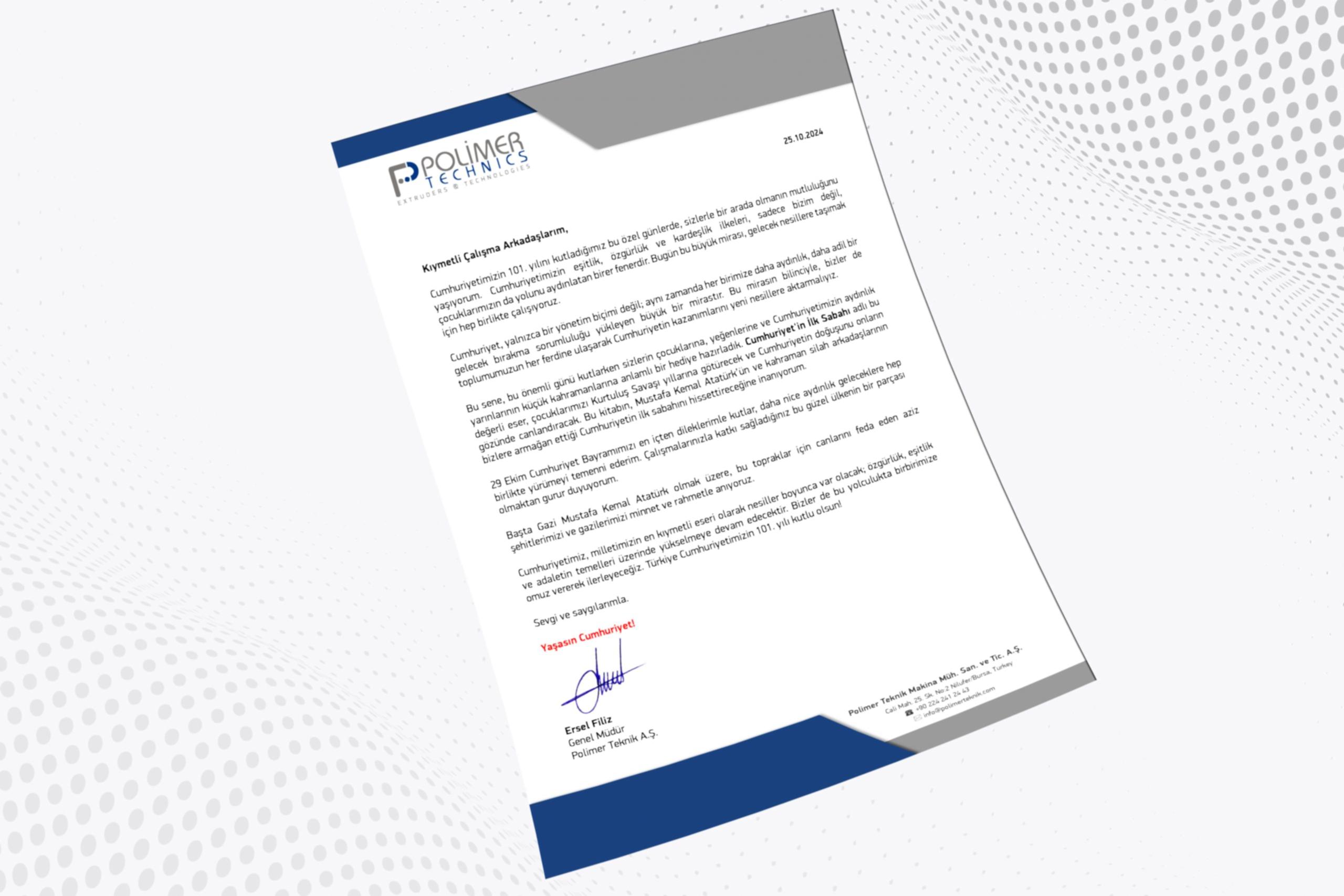 Polimer Teknik Genel Müdürü Ersel Filiz, Polimer Teknik ekibinin Cumhuriyet Bayramını kutladı.
